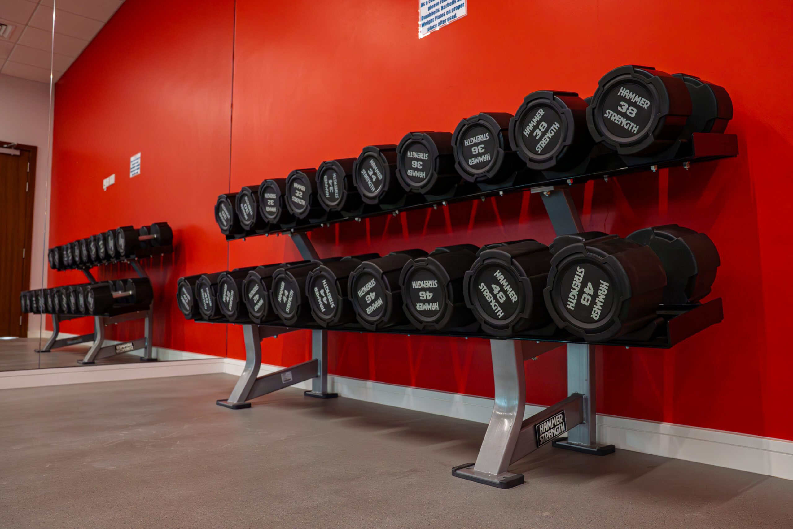 Equipped with exercise machines, weights, and cardio equipment.