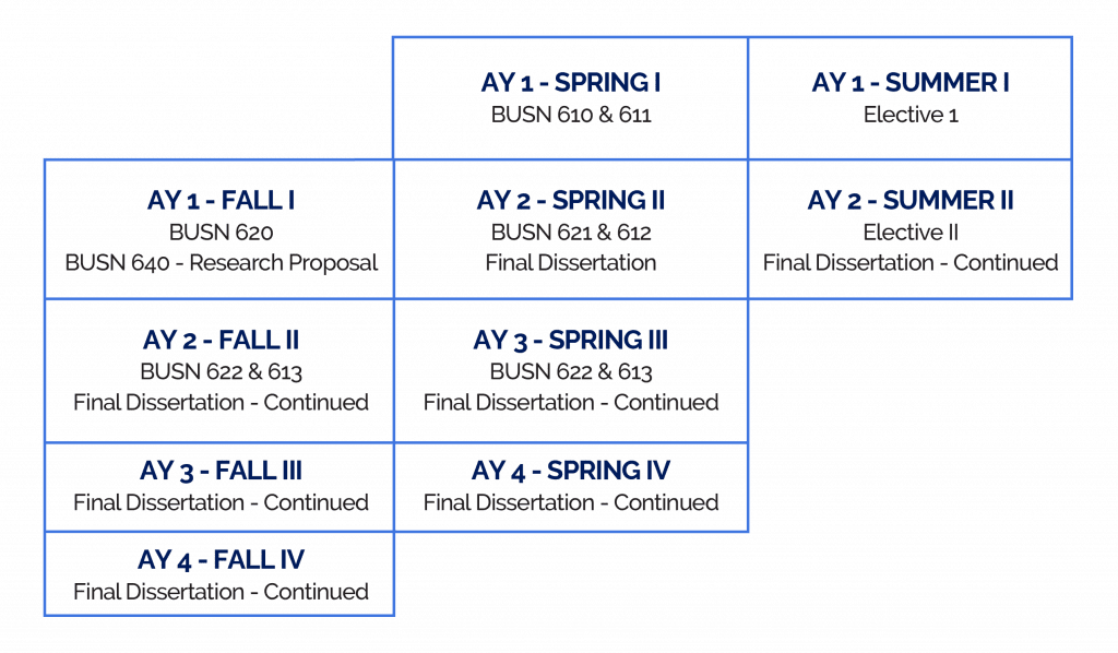 All candidates pursuing the DBA must complete a minimum of 60 credits with a cumulative GPA of 3.0 or higher. The structure of DBA program is based on 7 core requirement courses and 2 elective courses, each of 3 credits, plus a research proposal course of 9 credits, and a final dissertation of 24 credits. The program is designed to be completed within a minimum of